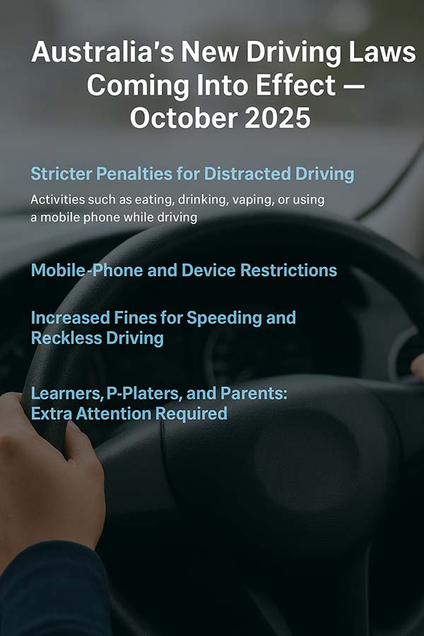 Australia is stepping up its road-safety enforcement from October 2025 with a set of new national-level and state-aligned driving regulations. These changes are designed to reduce distraction, improve driver focus, and significantly cut down on road fatalities and injuries.
