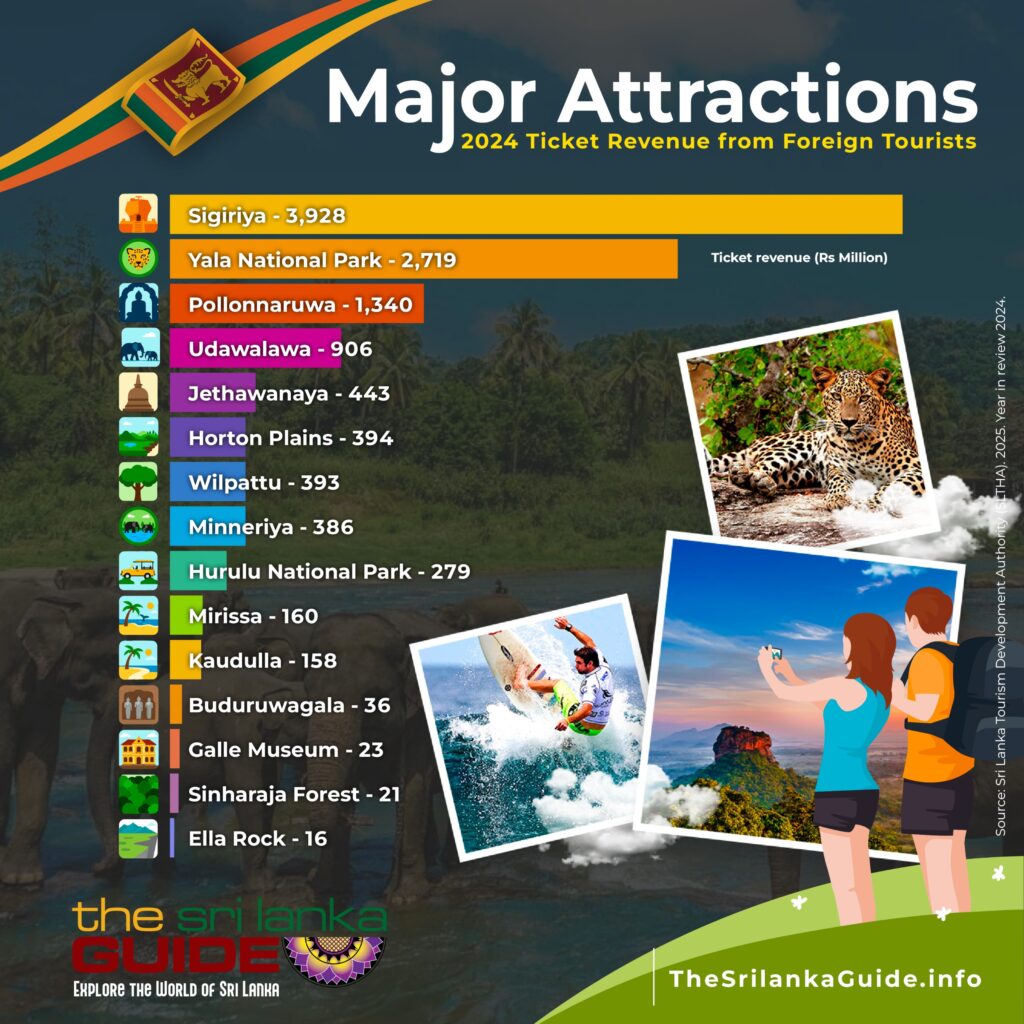 Sri Lanka’s tourism industry continued its strong rebound in 2024, generating impressive foreign ticket revenues across its most popular destinations. According to the Sri Lanka Tourism Development Authority (SLTDA) 2025 Year in Review, the country’s cultural icons and wildlife parks remained the top revenue earners, reflecting the island’s rich mix of heritage, adventure, and nature-based tourism.